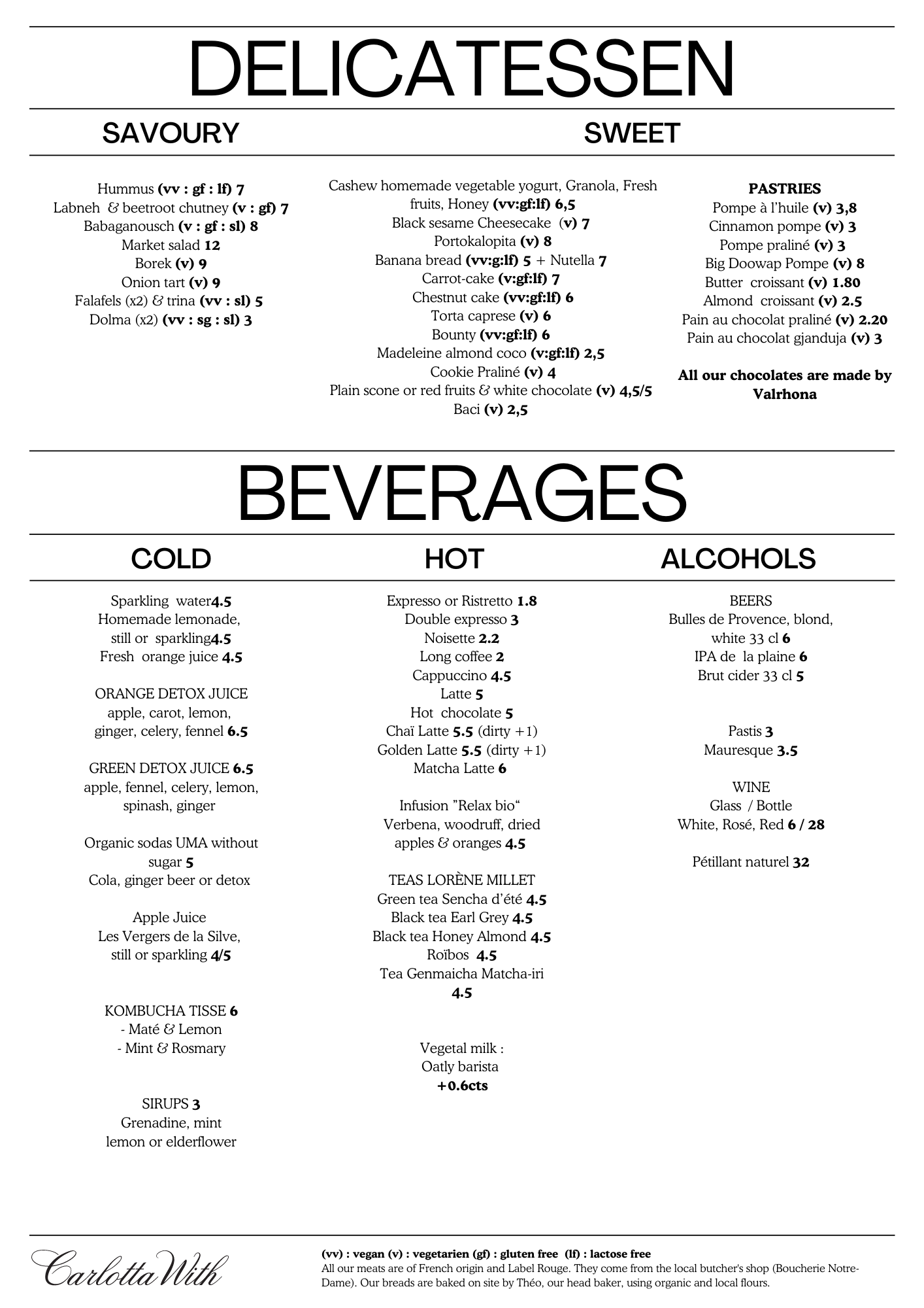 Je vous partage ici nos cartes, petit-dej, déjeuner, boissons… susceptibles d’évoluer selon nos réceptions et inspirations jusqu’au jour de votre venue <3